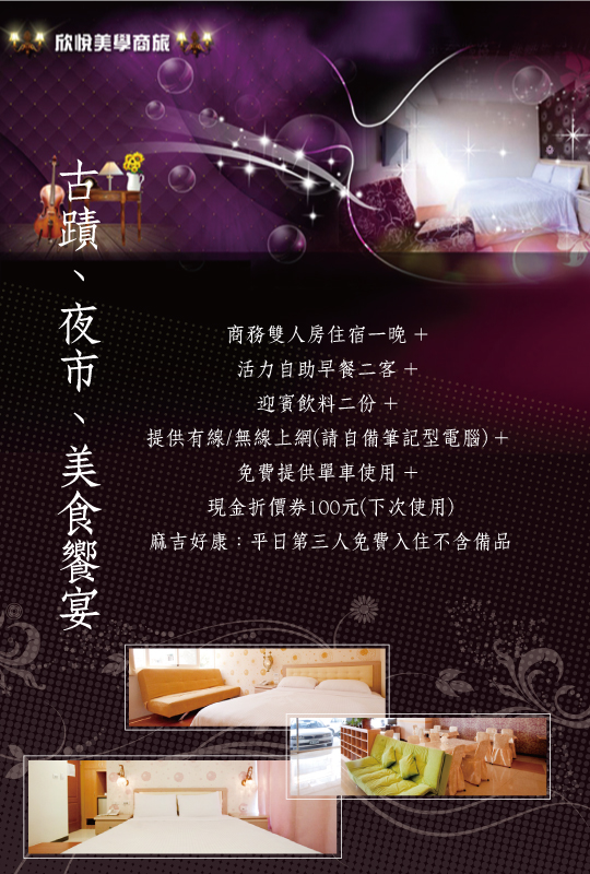 只要1180元起,即可享有【台南-欣悅美學商旅】古蹟、夜市、美食饗宴〈含商務雙人房住宿一晚 + 活力自助早餐二客 + 迎賓飲料二份 + 提供有線/無線上網(請自備筆記型電腦) + 免費提供單車使用 + 現金折價券100元(下次使用)〉麻吉好康:平日第三人免費入住不含備品